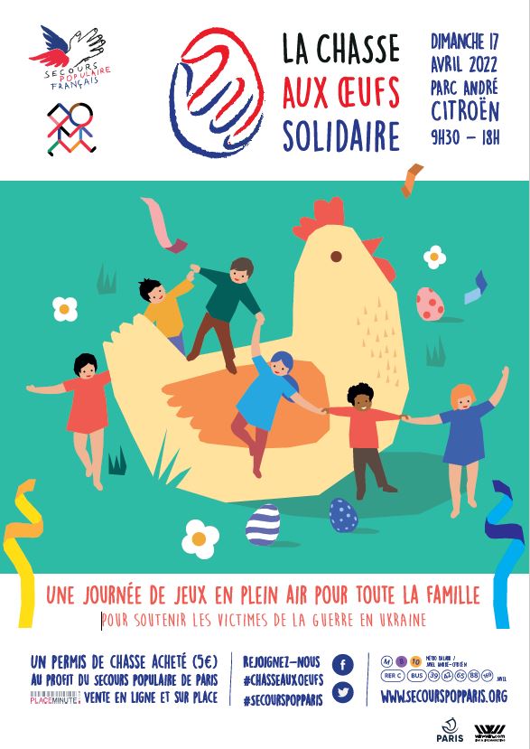 Le dimanche 17 avril 2022 de 9h30 à 18h, plus de 2 500 enfants sont attendus et se mettront en quête d’œufs et autres plaisirs chocolatés, en participant aux nombreux jeux, activités sportives, énigmes ou ateliers créatifs concoctés par le Secours Populaire de Paris et ses partenaires. 200 bénévoles du Secours Populaire de Paris seront mobilisés pour encadrer et animer cette journée placée sous le signe de la fête, de la gourmandise et de la solidarité. L’intégralité des recettes de cet événement ouvert au grand public sera consacrée à l’aide des familles, enfants, personnes âgées victimes du conflit en Ukraine et réfugiés dans les pays frontaliers, notamment en Pologne et en Roumanie en association avec les partenaires locaux du Secours Populaire engagés au plus proche des victimes du conflit. #chasseauxoeufssolidaire Des activités sportives, solidaires et créatives pour les 3‐10 ans Plusieurs parcours d’activités et petites épreuves seront proposés en fonction de la tranche d’âge des enfants inscrits : 3‐5 ans, 5‐8 ans, 8 ans et plus. À l’approche des Jeux Olympique de Paris 2024, un accent tout particulier sera mis sur le sport et ses valeurs de partage, de sociabilisation et d’émancipation, chères au Secours Populaire.