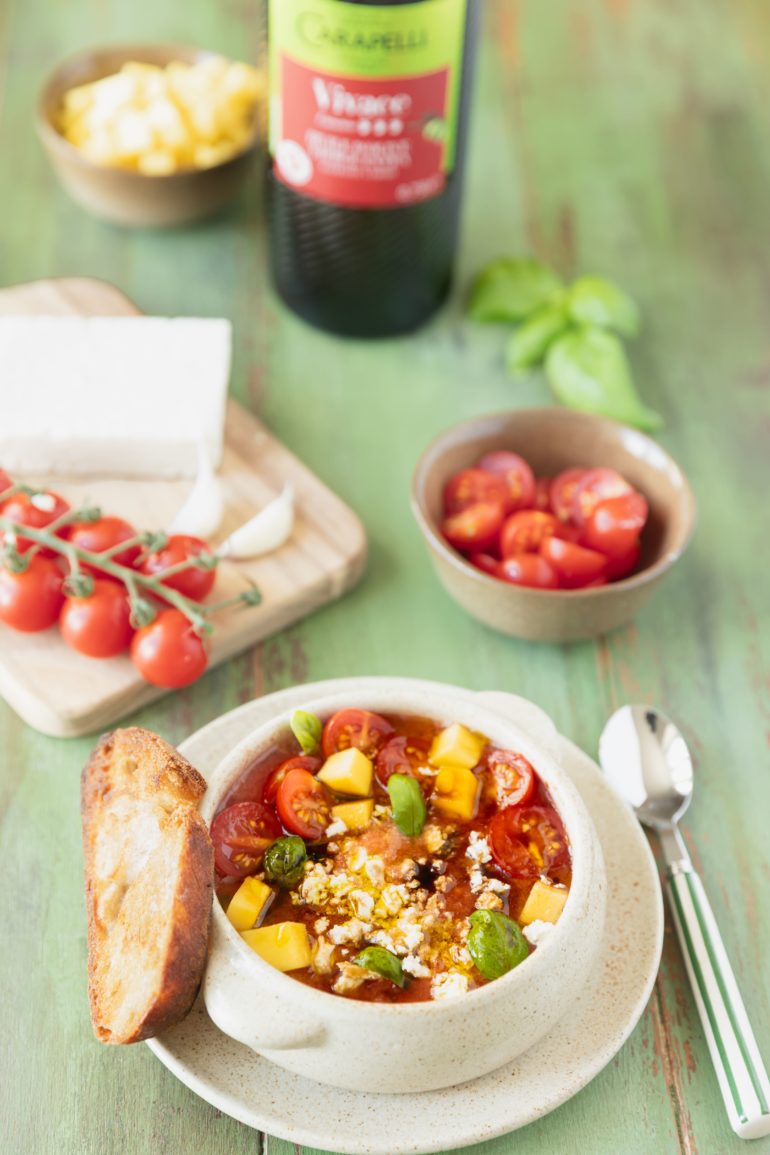 - Mixer les tomates et une pêche avec de l’huile d’olive Vierge Extra Vivace Carapelli®.