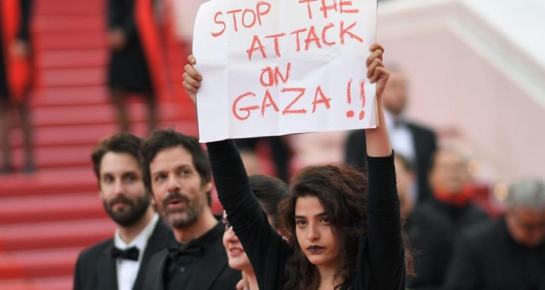 C’est bien loin du chaos des affrontements, devant un tapis de photographes plus habitués à photographier des robes de couturier, que Manal Issa a décidé de brandir une affiche « STOP THE ATTACK ON GAZA !! » (« Arrêtez l’attaque sur Gaza »).