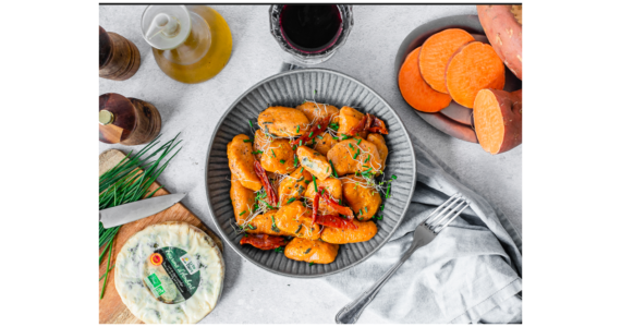 Ingrédients : 600 g de patates douces 300 g de farine de blé blanche (T55) Sel, noix de muscade, poivre noir 200 g de Fourme d’Ambert La Vie Claire 10…