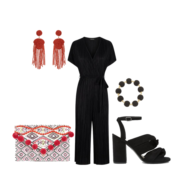Pour le premier de cette série, direction NEW LOOK. On a choisi d’opter pour une combinaison pantalon, un classique qui peut se porter pour toute occasion. On apporte une touche de gaieté et de couleur avec les boucles d’oreilles et le sac ethnique à pompons. Un look à la pointe avec les sandales à talons épais qui sont la tendance incontournable cette année !