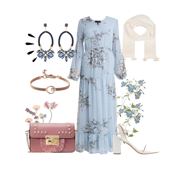 Une tenue dans un style romantique et champêtre, avec une robe maxi à imprimé floral. Un look plutôt habillé, pour un resto avec le chéri ou entre copines. Des sandales à brides fines et talons épais, une des tendances incontournables de la saison. Et les magnifiques boucles d’oreilles, si vous portez votre foulard en turban, elles apporteront une petite touche de sophistication.