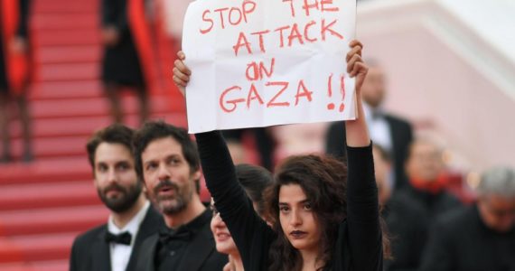 L’actrice franco-libanaise, Manal Issa, brandit une affiche en soutien à Gaza, sur le tapis rouge du festival de Cannes, le 15 mai. C’est…