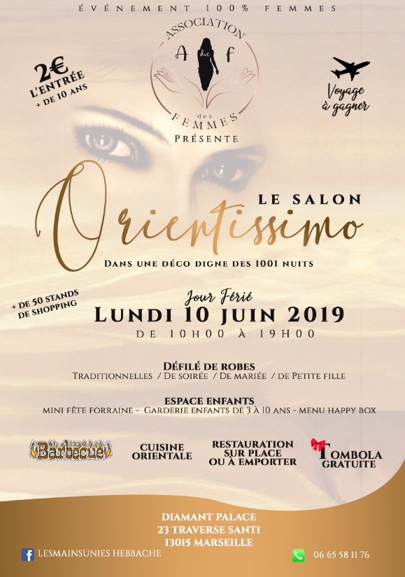 Le lundi 10 juin entre 10h et 19h, le salon Orientissimo propose une journée où la Femme est à l’honneur au Diamant Palace de Marseille (23 traverse Santi 15ème) ! Des défilés de robes traditionnelles, une mini fête foraine et de nombreux stands de shooping et de cuisine : tout y est pour se chouchouter et se faire plaisir, pour seulement 2 euros l’entrée !