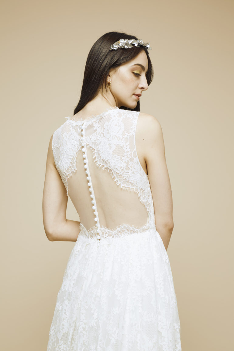 Là, quelques cinquante looks sont mis en avant sur les portants aérés, par style et créateur. Des robes mais pas seulement, puisque ici on suit les tendances les plus pointues, comme la combinaison de mariée et l’ensemble deux pièces. Ici, il n’y a rien d’ostentatoire, de mass market, de commun et encore moins de cheap. On est loin des magasins usuels, où les mariées s’agglutinent devant des rayons sans âme. Non, ici, on prend le temps, on fait connaissance avec la broderie, la dentelle, la soie comme pour mieux organiser ce coup de foudre à venir.