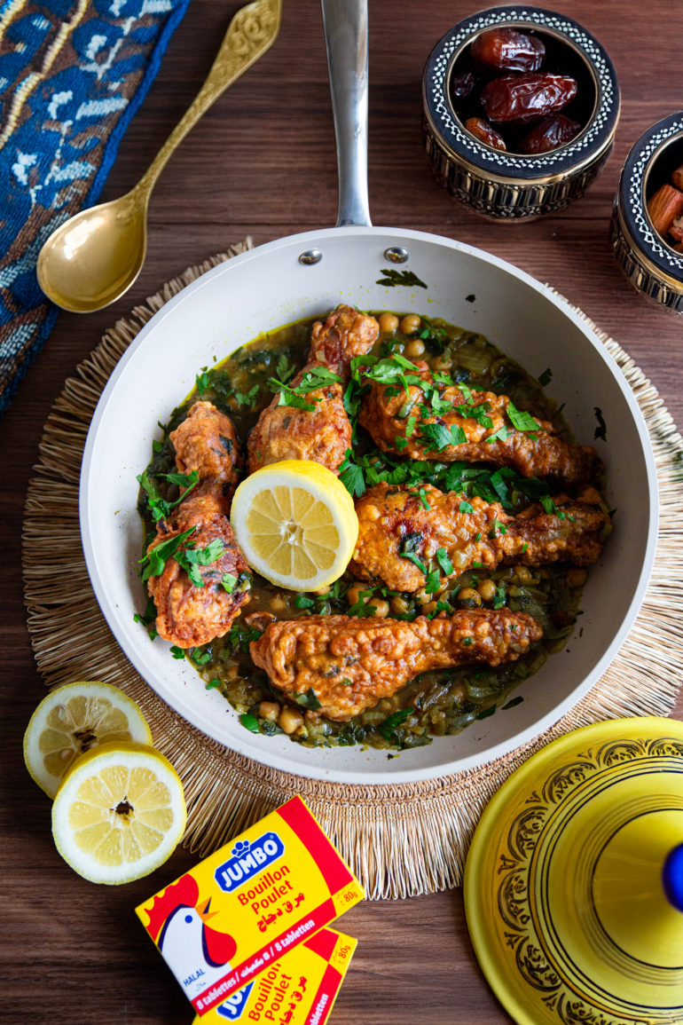 Ajoute avec les oignons émincés la moitié du persil haché. Laissez revenir 5 min à feu doux, jusqu’à que les oignons soient translucides. Additionnez les pois-chiches et émiettez les 2 tablettes de bouillon de poulet Jumbo sur la viande. Ajoutez le cumin, la cannelle, le poivre et couvrez d’eau chaude à hauteur.