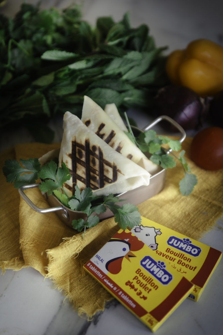 Dans une poêle, faites revenir l’oignon émincé et le poivron épépiné et en dès avec un peu d’huile jusqu’à ce qu’ils soient tendres. Additionnez la tomate en dès et poursuivez la cuisson quelques minutes. Ajoutez les dés de poulet, le curry en poudre, et l’émietté de bouillon de poulet Jumbo et un verre à thé d’eau. Attendez jusqu’à ce que le poulet soit bien cuit et qu’il ne reste plus de liquide. Assaisonnez avec du sel et du poivre. Prenez un cercle de tortilla, coupez-le en deux demi cercles. Tartinez le demi cercle de fromage frais pour faciliter le pliage. Ajoutez une cuillerée de farce à la base et saupoudrez d’un peu de gruyère râpé. Prenez les deux coins arrondis de votre quart de cercle et pliez-les l’un vers l’autre, en les superposant légèrement au centre de manière à obtenir une bande. Repliez la farce sur elle-même de manière à obtenir un premier triangle et rabattez-le jusqu’à l’extrémité.