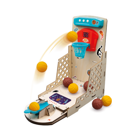 Un panier électronique sans soudure à asssembler facilement et en toute sécurité ! Le tableau des scores, le haut-parleur et le panneau de contrôle réagissent à chaque panier marqué. Ils comptent les points et le temps mis entre chaque point comptabilisé par chaque joueur. Le panier est personnalisable avec des autocollants.