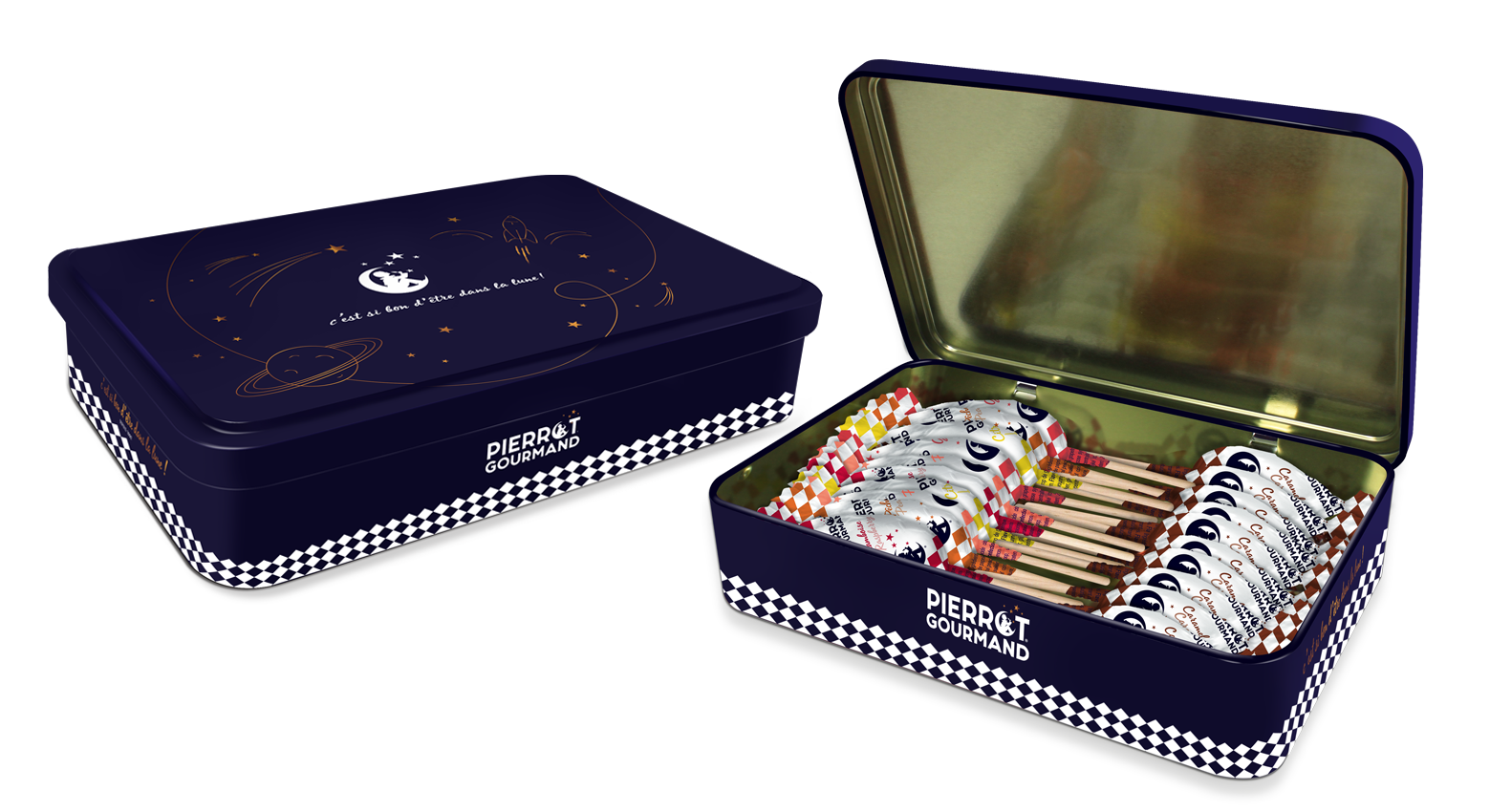 Pierrot Gourmand réunit 20 sucettes iconiques « Fer de Lance » dans ce coffret métallique au design rétro. Parmi les parfums rangés soigneusement à l’intérieur, se trouvent 10 sucettes au caramel au lait frais et 10 aux fruits (citron, pêche, framboise, pamplemousse, grenadine). Une jolie boîte avec de la confiserie réalisée avec un savoir-faire d’antan à partager ou à offrir.