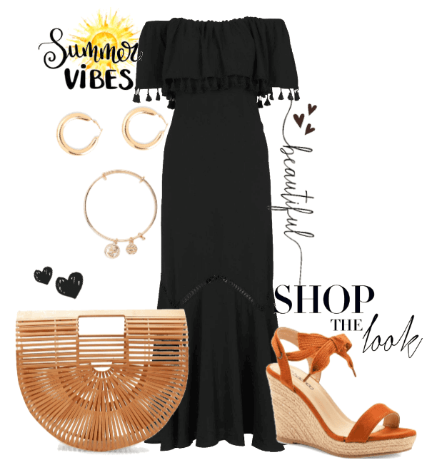 Pour ce look, direction Boohoo ! On combine deux tendances de cette saison dans une même pièce : robe maxi et épaules dénudées ! Et avec une telle robe, on ne pouvait choisir que des créoles pour parfaire le look bohème.