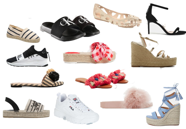 On retrouve les grands classiques : sandales plates ou compensées, les espadrilles, les mocassins. Les ballerines font un retour discret, on remarque aussi que la tendance sportive se poursuit, avec des baskets plutôt massives ou au contraire des tennis.